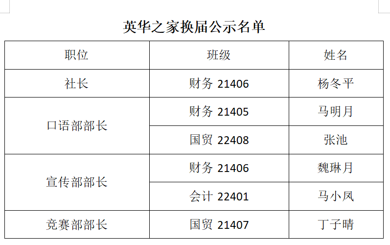 为了进一步营造学习、团结向上的社团氛围,培养员工的集体荣誉感和责任心。MKsports英华学习之家通过自主报名与竞选演讲,让竞选同学都有展示能力的机会,结合各位竞选人在英华学习之家的工作表现,经指导教师与英华学习之家原负责人的商议决定以下结果,现公示英华学习之家换届名单: