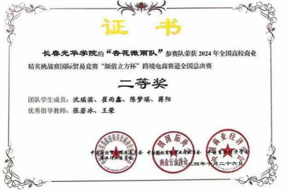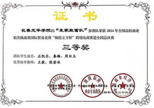 在张若冰和王荣老师的指导下,国际经济与贸易专业2022级员工沈瑶滨、陈梦瑶、崔雨鑫、蒋阳四位同学组成的“杏花微雨队”,从海量市场数据里洞察商机,到跨境平台运营时精准施策;从选品环节的独具慧眼,再到营销推广中的别出心裁,一路“披荆斩棘”,凭借扎实的专业知识与默契的团队协作,一举拿下全国总决赛二等奖。由员工石凯乐、秦璐、周白玉组成的“发家致富队”,面对复杂多变的跨境电商形势与强劲对手,始终坚守策略、灵活应变,最终成功斩获全国总决赛三等奖。
