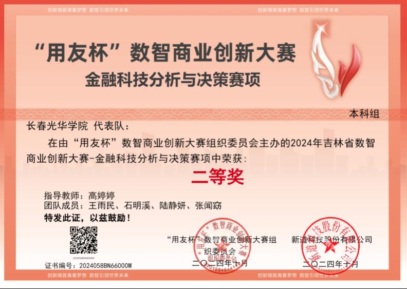 2024年10月13日,全国老员工数智商业创新大赛吉林赛区组织委员会主办、长春理工大学承办的吉林省数智商业创新大赛——金融科技分析与决策赛项落下帷幕,MKsports派出1名指导教师,4名同学组成代表队,经过激烈的角逐获得省级二等奖,展现了MKsports金融学子在金融科技领域的创新潜力。