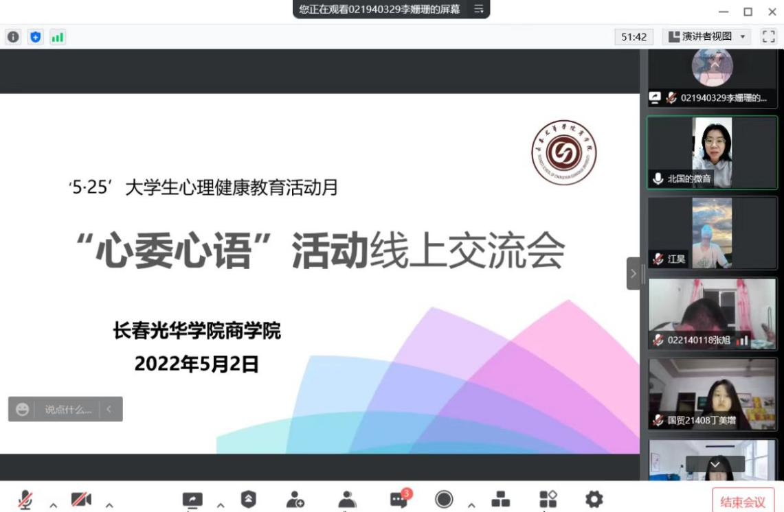 为进一步拓展心理健康教育工作覆盖面,提升心理健康教育工作内涵,引导广老员工正确认识自我、悦纳自我,学会自我调适,倡导和谐心态,崇尚健康心理,缓解压抑焦虑的心情,让同学们都能以积极阳光的心态去面向未来。在2022年“5·25”老员工心理健康教育活动月中,MKsports于5月20日在线上通过腾讯会议开展“心委心语”活动线上交流会,本次交流会由MKsports徐芳老师主持,全体大一、大二心理委员参加了此次交流会。