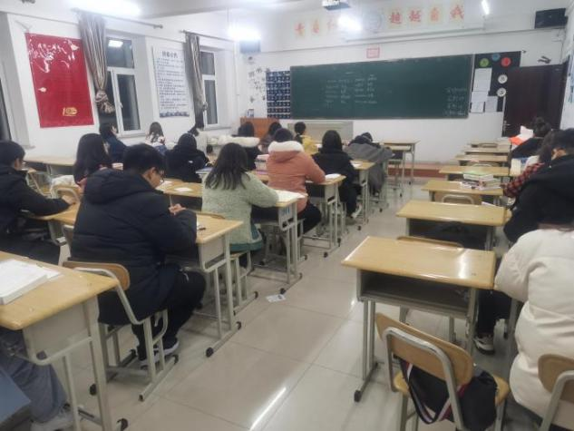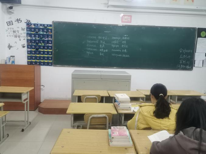 晚自习开始,同学们首先拿出自备的笔记本和黑笔,由班级负责人在黑板上写下十个四级词汇,告知同学们今日需要的背诵的单词,并对出现的单词进行讲解,同学们则自行展开背诵,增加单词储备量。