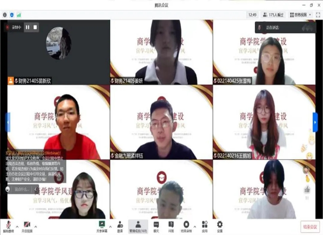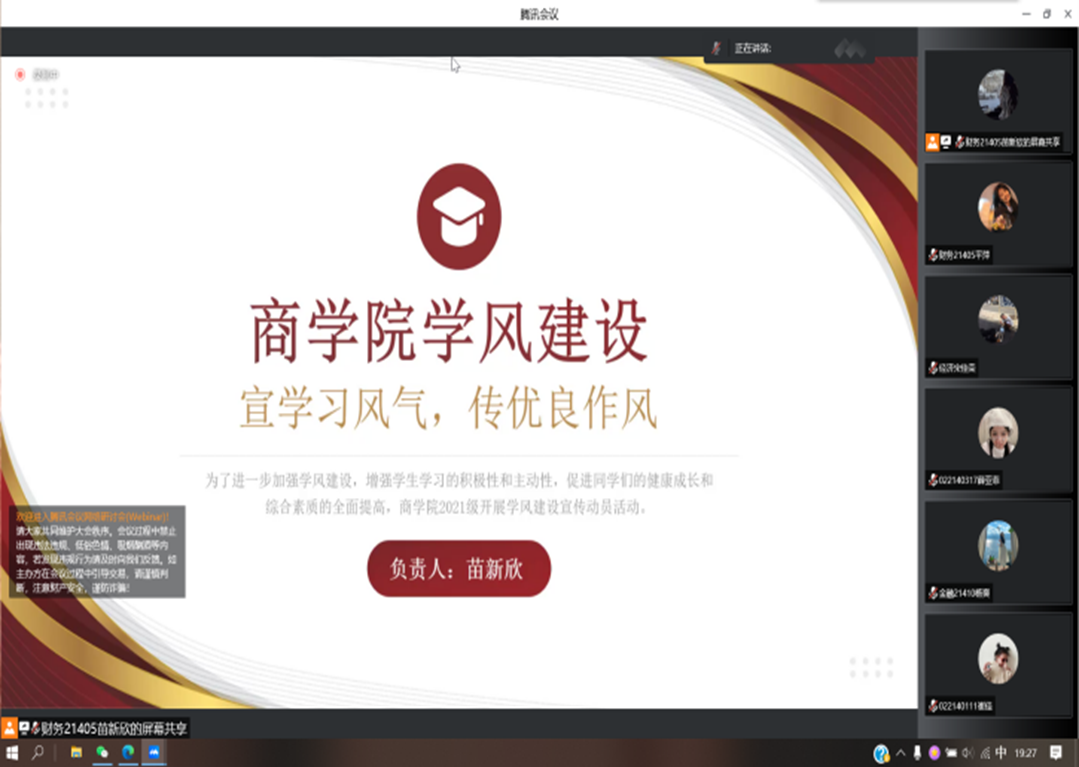 会议伊始,此次活动主持人苗新欣为同学们介绍了学风建设的意义以及公司对学风建设的具体要求。活动第一项:学风宣讲比赛正式拉开序幕,主持人为大家介绍参加学风宣讲比赛同学的基本信息、比赛赛制以及线上抽签决定上场顺序,活动中学风宣讲员逐一进行学风主题的演讲,他们以自己的视角讲述了对学风建设的认知并畅想了学风建设的蓝图,可以说演讲过程十分精彩,观众席的同学们通过公屏为她们点赞、加油鼓劲。