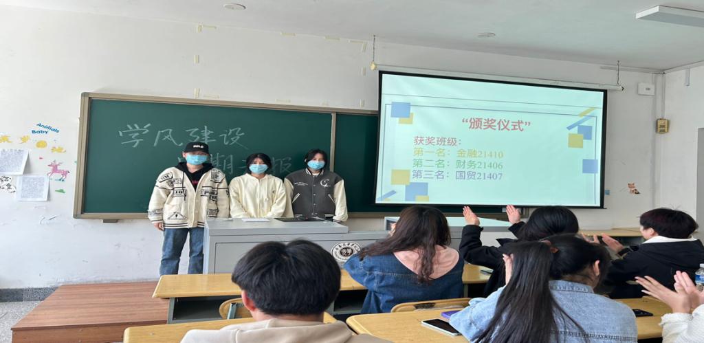 紧接着,学风建设小组本着公开、公平、公正的原则,由各组长进行打分,选出前三名。最终评选结果如下:第一名金融21410班;第二名财务21406班;第三名国贸21407班。主持人指出:培养集体主义感,是形成良好的班风学风的前提,必须要同学们的共同努力、相互团结才能实现,以上三个班级使班级良好的学风得到发扬,优良传统得以继承。