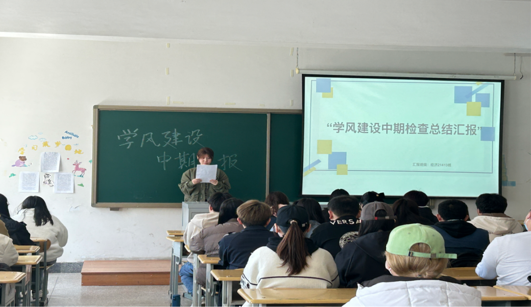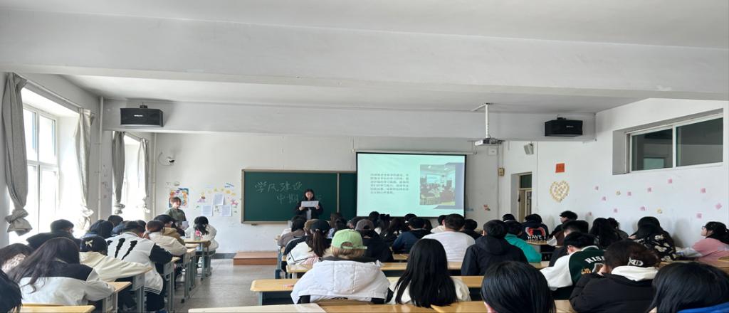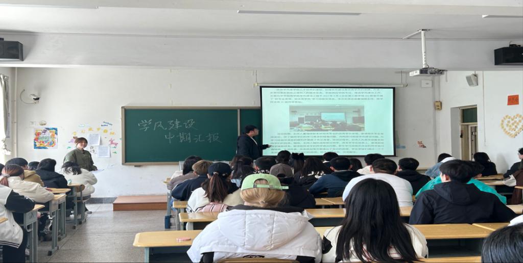会议伊始,活动主持人对到场的各班同学表示热烈欢迎,并宣布了学风建设中期检查活动正式开始。随后,各班学风建设小组代表通过PPT、视频展示,结合班级建设特点,着重围绕优良学风建设的成效,从班级概况、学习成果、中期总结等方面进行汇报。