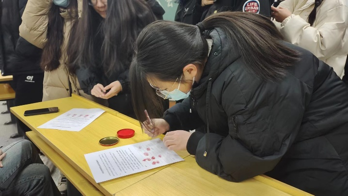 接着,张桐作为员工代表,庄重地宣读了诚信应考承诺守则,进一步加深了同学们对考试管理规定的了解。最后,同学们按照班级顺序,在承诺书上庄重地签上了自己的名字,并按上了手印。每一个手印都代表着同学们对此次考试的恪守不渝,也代表着他们抱诚守真的态度。