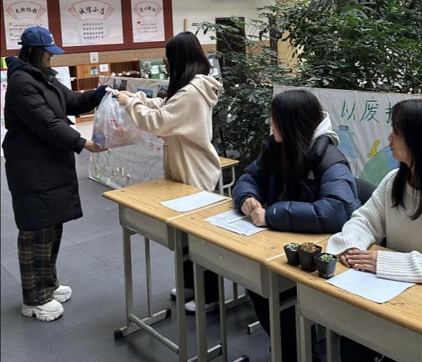 活动过程中,同学们纷纷拿着自己平时积攒的易拉罐、纸盒等废品,来到活动现场进行置换。工作人员事前制定了一套详细的兑换细则,以确保置换过程的公平公正。在活动现场,工作人员与参与者进行了置换。同学们通过废品置换,得到了精美笔记本、实用文具以及绿色盆栽等礼品。参与活动的同学们纷纷表示得到了实实在在的物质回报,还增强了环保意识和社会责任感,这次活动带来的影响绝不仅仅是一次的简单置换,真正领悟到了正确处置废品的重要性与必要性,在之后的生活学习中,会更加融入绿色环保的生活圈。