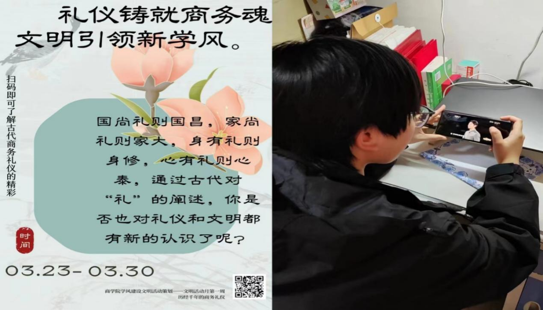 在本次“文明学风建设月”活动开始的第一周,叶书维同学策划“历经千年的商务礼仪”的特色活动并设计海报向师生们发出邀请。同学们通过扫描海报上的二维码即可观看相关的礼仪视频,从而深入了解礼仪的起源、演变以及在商务场合中的实际运用。