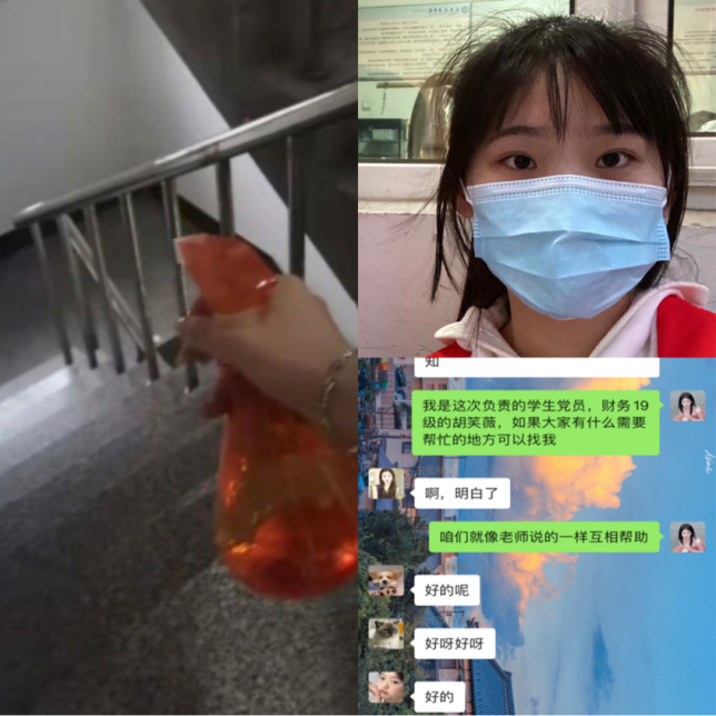 作为一名员工党员,胡笑薇同学以身作则投身于公司的疫情防控工作,严格把控员工出入,同时,她积极协助党员老师对隔离人员进行心理疏导,帮助员工日常生活,避免员工因隔离而给自身带来的心理健康问题,平常督促寝室人员消毒,开窗通风,测体温,约束好自己,为抗疫贡献自己的力量。