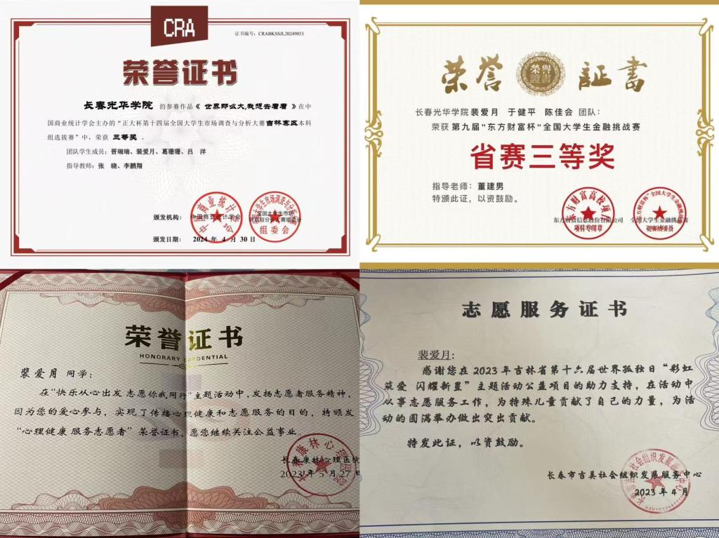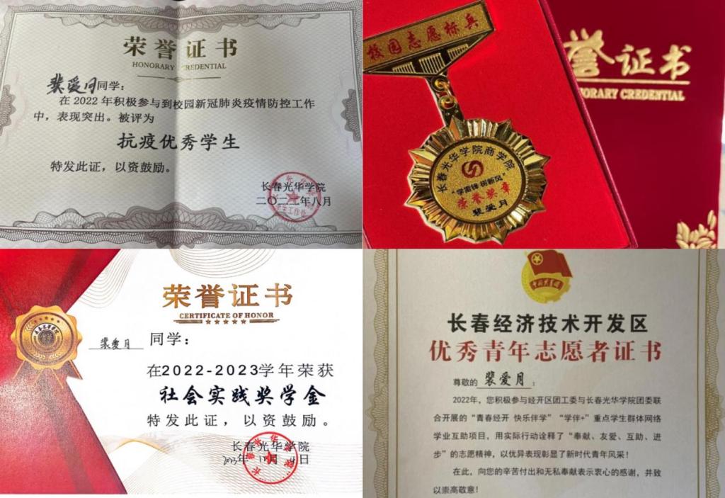 在学业上,她勤奋刻苦,始终保持着优异的成绩,学习成绩排名学年前30%。同时,她积极参加各类学科竞赛,在东方财富、市场调研等省级比赛中崭露头角,凭借扎实的专业知识和创新思维,斩获多项省级奖项,展现出了卓越的专业素养和实践能力。