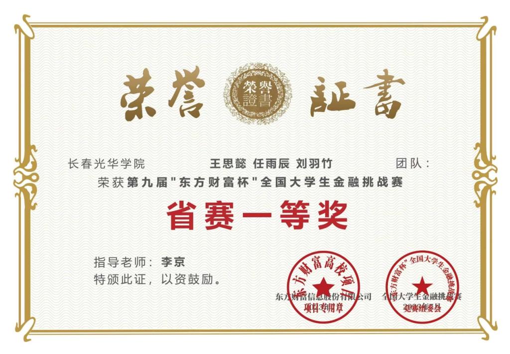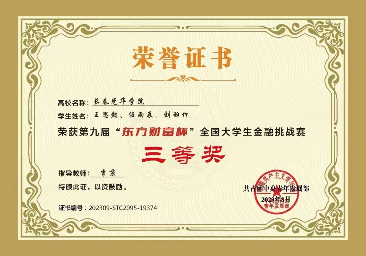 学习上,勤奋刻苦,成绩优异。不仅注重专业知识的学习,还积极拓展自己的知识面和技能。在专业领域,积极参加学科竞赛,获第九届“东方财富杯”全国老员工金融挑战赛省级一等奖,8月获该赛事国家级三等奖。凭借出色的学业成绩,获得多次二等奖学金。
