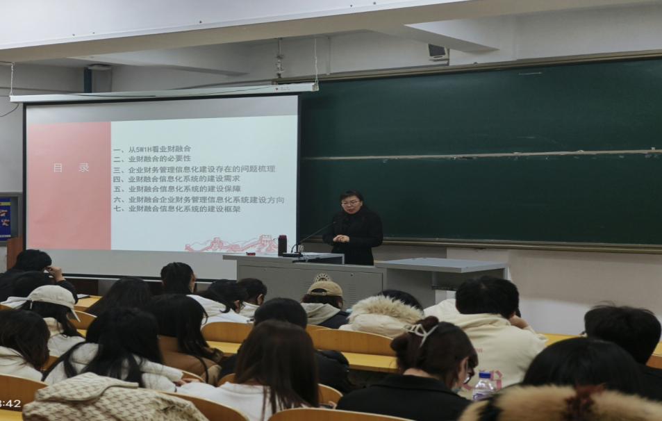 首先,王吉凤向同学们介绍了在市场竞争加剧,国内经济复苏稳固增长背景的下,企业运营面临着前所未有的挑战。财务管理工作贯穿于企业运营的全过程,通过引入信息化建设,实现二者有机结合,能够有序拓展财务管理职能空间,提升管理效率,助力于企业价值创造,促进战略目标的达成。与此同时,随着财务管理工作不断优化升级、职能拓展,单纯的账目核算、监督核对已无法满足现代企业的需求,更要与业务、战略相融合,不断提高数据匹配度与敏感度,紧紧抓住市场机遇,为企业提供高效的财务管理服务。
