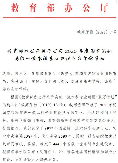 2021年2月22日,教育部办公厅发布了《关于2020年度国家级和省级一流本科专业建设点名单的通知》(教高厅函〔2021〕7号),公司会计学专业获批国家级一流本科专业建设点。